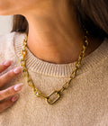 Necklace with fine gold ion-plated steel links, featuring two interlaced motifs.